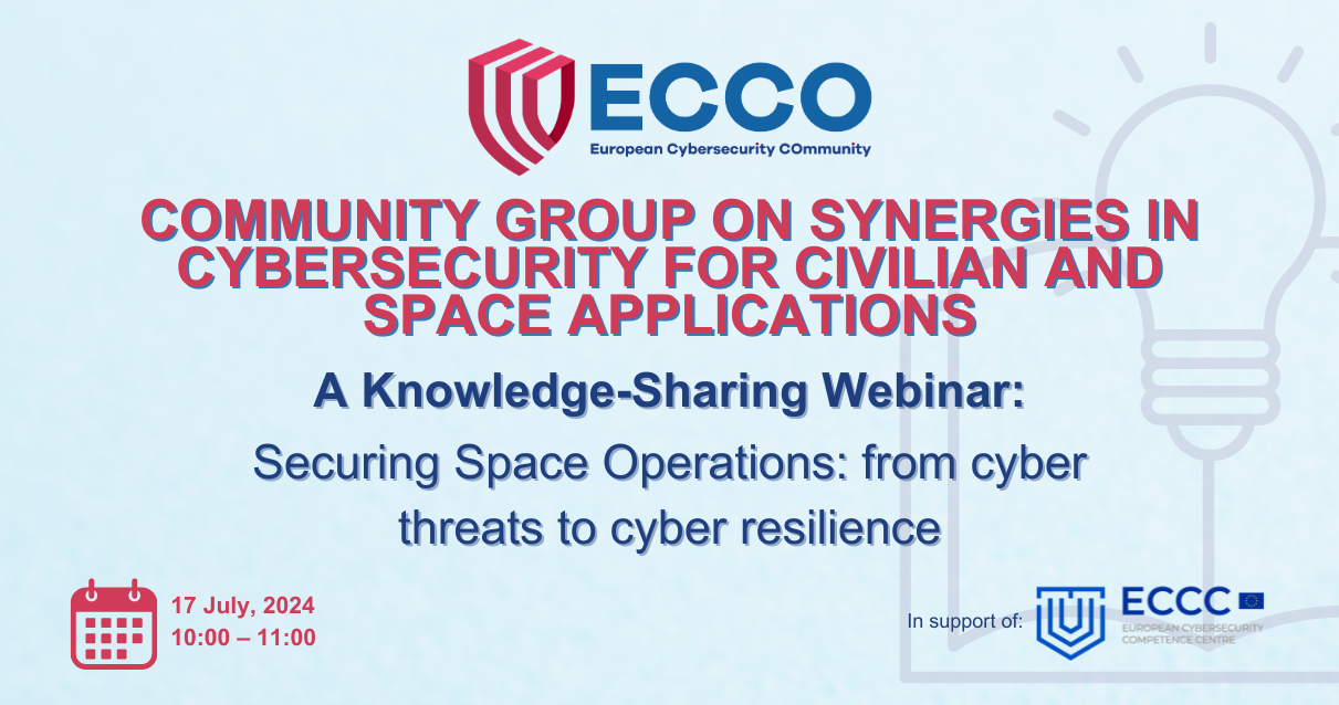 The European Cyber Security COmmunity Project (ECCO), in support of the ECCC, announces its new knowledge-sharing webinar focused on cyber threats and attacks in the space sector, that will take place on 17 July 2024 from 10:00 to 11:00 CEST. This online discussion is organised by the ECCO Community Group on Synergies in Cybersecurity for Civilian and Space Applications.